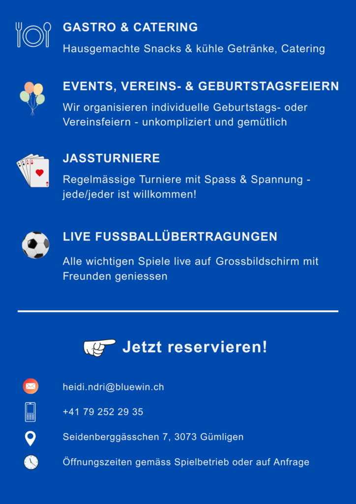 Grundsätzlich ist das Clubhaus bei Heimspielen ab der Rückrunde der Saison 2025/26 des FC Muri-Gümligen geöffnet.